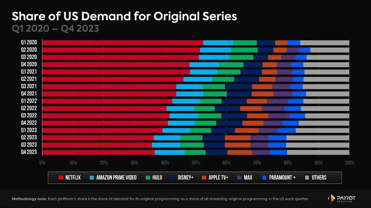 🌐📉 Netflix's Reign Challenged: Netflix's long-standing market dominance is facing significant challenges. Analysis from Parrot Analytics reveals a decreasing trend in market concentration, especially in the U.S. This shift is attributed to the emergence of new platforms like Disney+ and Max, which have been gaining traction since their respective launches in late 2019 and mid-2020. While Netflix experienced a marginal increase in demand share towards the end of 2023, thanks to hits like ‘One Piece’ and ‘The Fall of the House of Usher,’ the overall trend indicates a more competitive streaming environment. The 'Other' category, which includes services like Bet+, iQIYI, and AMC+, has seen its demand share rise from 15% in 2021 to over 20% by the end of 2023, underscoring the growing presence of alternative streaming platforms and hinting at a more diversified future for the streaming industry.