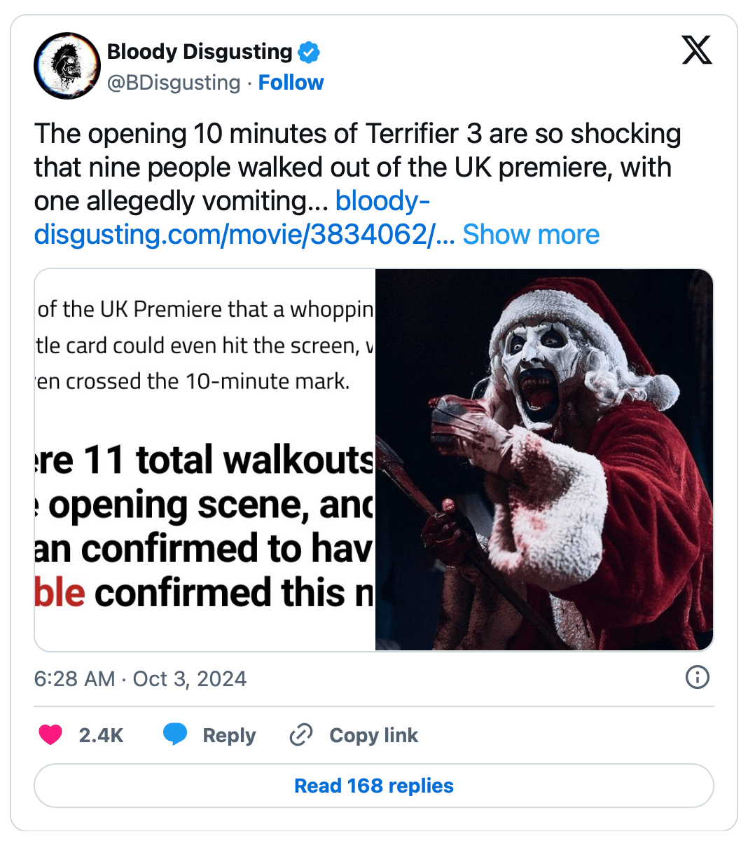 'Terrifier 3's $2M gore-fest carved out a shocking $19M opening weekend.