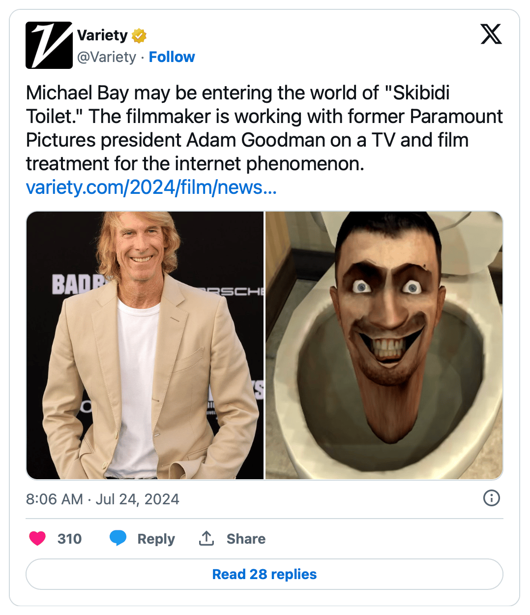 The bizarro YouTube sensation ‘Skibidi Toilet’ might be making a splash in Hollywood. For the uninitiated (read: anyone over 15), ‘Skibidi Toilet’ is a fever dream of singing toilet heads battling TV-headed cyborgs that's racked up a mind-boggling 17B views on YouTube. It's like if David Lynch directed a Pixar movie after binging on energy drinks and LSD. Michael Bay and Adam Goodman are flushing out plans to bring this phenomenon to the big screen, potentially mixing live-action with animation in a style they're dubbing "John Wick meets District 9." It's the latest example of studio execs capitalizing on pre-existing audiences in our IP-obsessed era, with this particular goldmine spawned by a Alexey Gerasimov, a then 23-year-old creator from Georgia (the country, not the state). Gerasimov's 11-second video uploaded in Feb. 2023 exploded into a cultural phenomenon. If successful, this could be a golden ticket to luring Gen Alpha off TikTok and into cinemas. Welcome to 2024, where yesterday's viral video is tomorrow's tentpole franchise.