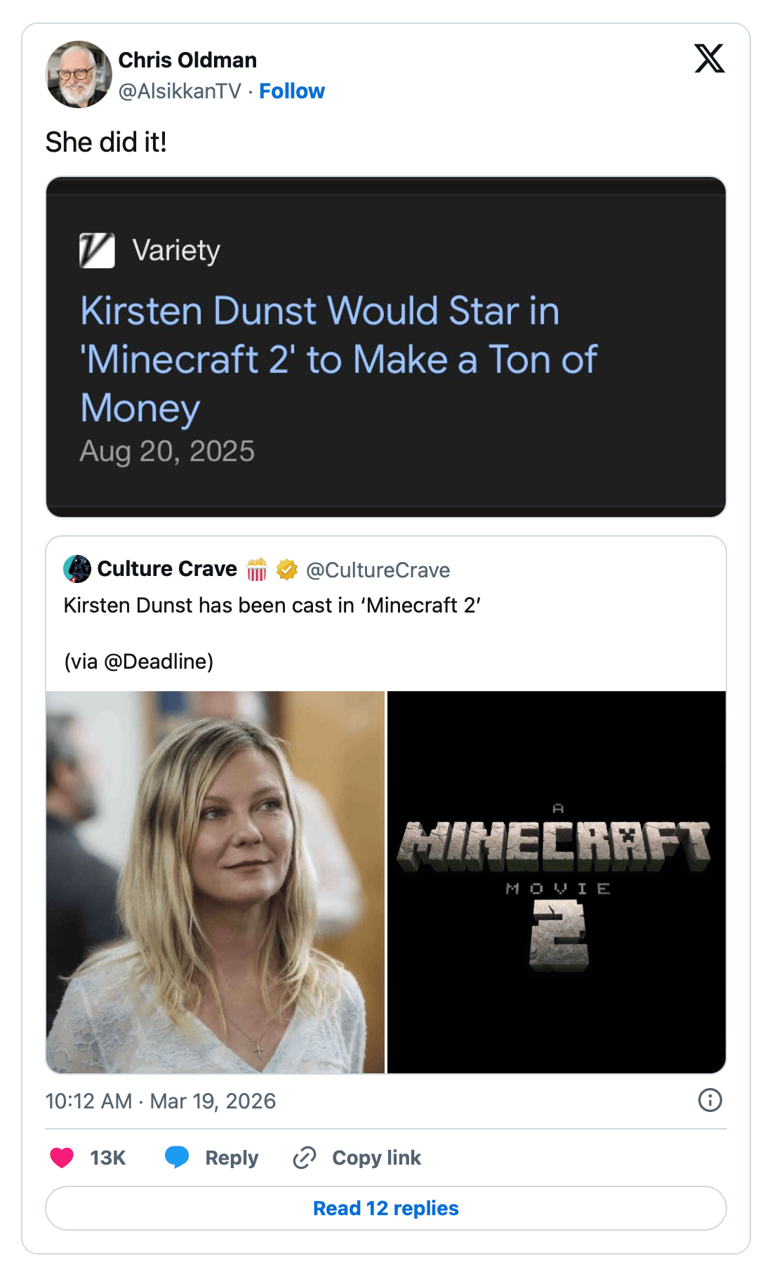 Kirsten Dunst joins the sequel to ‘A Minecraft Movie,’ alongside returning stars Jason Momoa and Jack Black. (more)