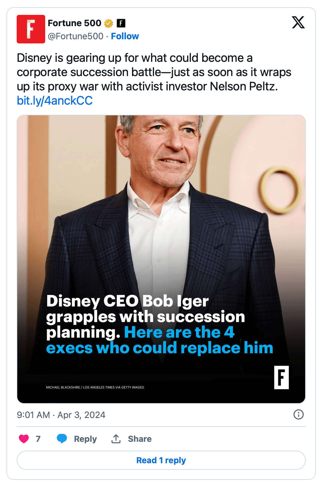 🏰🤔 Iger’s Next Battle: In the aftermath of the proxy battle with Nelson Peltz, Disney, under Bob Iger’s leadership, is now shifting focus to finding his successor by 2026. This transition is scrutinized closely, given the rocky transition from Iger to Bob Chapek in 2020, which saw Chapek exit amidst financial turmoil and a decline in share prices. Critics, including former Disney CFO Gary Wilson, accuse Iger of eliminating potential successors, leading to a leadership vacuum that necessitated his return in 2022. Now, with lessons learned, Iger and the board are meticulously searching for a successor, considering both internal and external candidates. Iger's looking for a successor who can juggle the evolving media landscape, including streaming's rise and the integration of platforms like Disney+ and Hulu. Despite past challenges, the recent proxy skirmish has unexpectedly boosted shareholder involvement, a dynamic Iger hopes will benefit Disney's journey towards a seamless and strategic leadership transition.