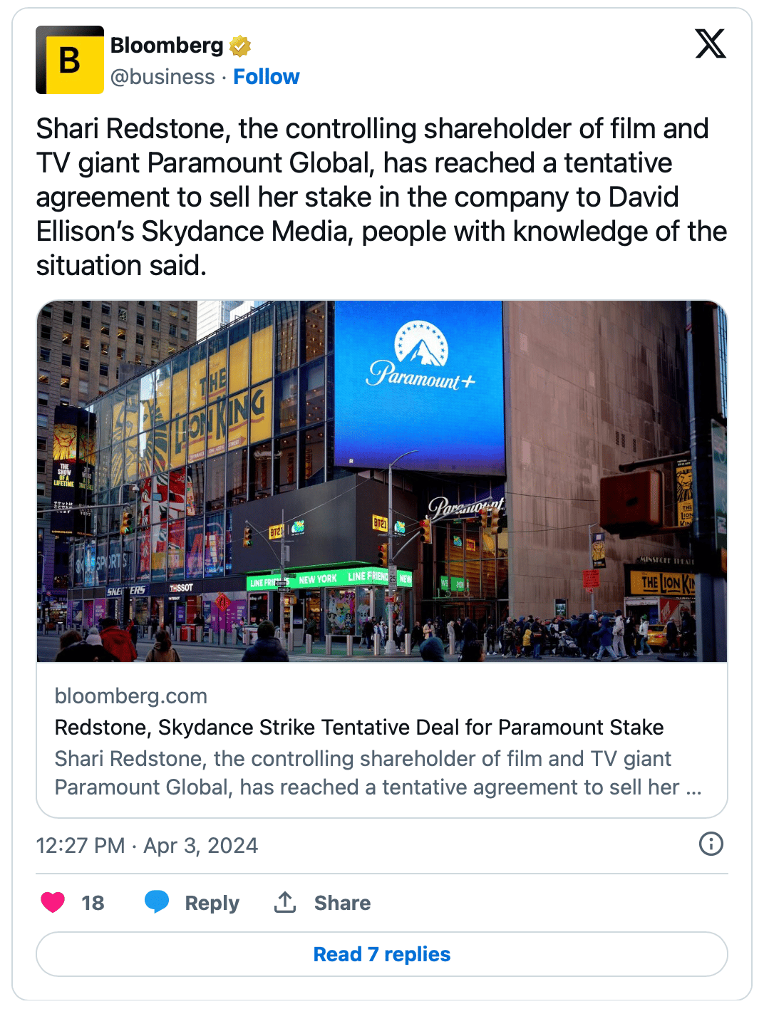 🎬🤝 Paramount Shake-Up Ahead? Shari Redstone, the media mogul behind Paramount Global is reportedly on the verge of selling her hefty stake in National Amusements Inc. (NAI), which commands an 80% voting power in Paramount. Word on the street is that she’s reached a tentative agreement to sell the stake to David Ellison’s Skydance Media. The deal's fine print remains under wraps, with no official word from either camp, despite the high-stakes dance of negotiation. Amidst the unfolding saga, Paramount's stock enjoys an uptick, thanks to a bullish stock upgrade from Wolfe Research. This comes against the backdrop of Apollo Global Management’s rejected $27B bid for the company. Analysts watch cautiously, weighing the potential reshaping of Paramount against a tapestry of financial and governance complexities.