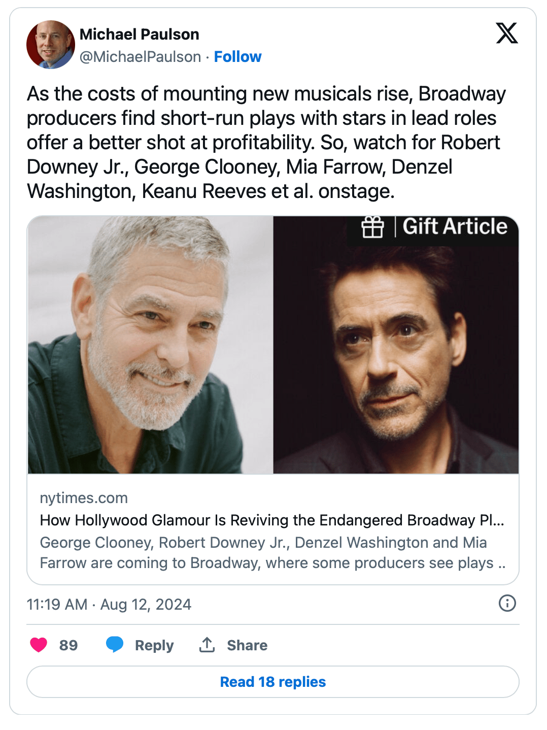For producers, a play with a celebrity lead is often a safer bet than a $20M+ musical spectacular.