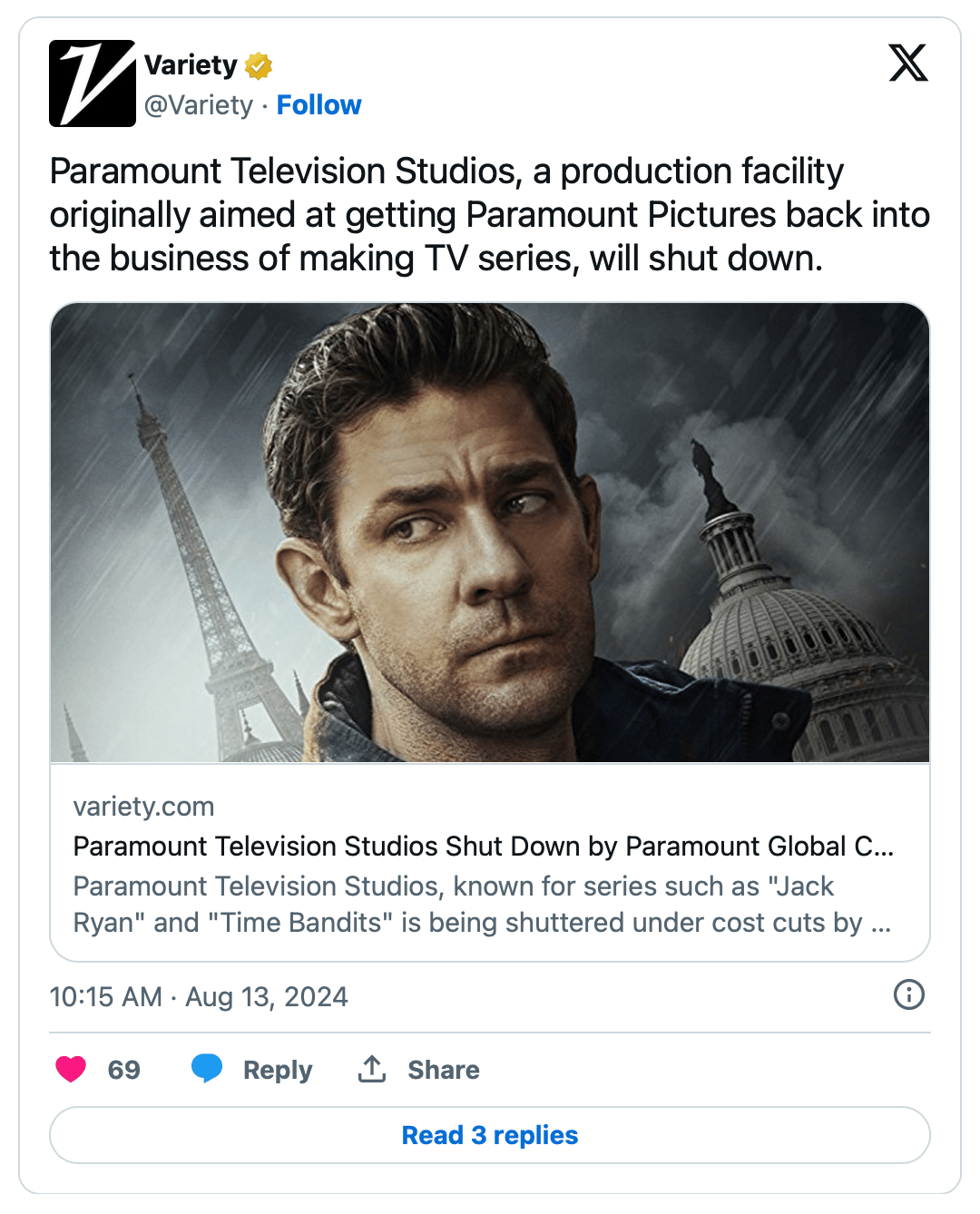 Paramount's shutting down Paramount Television Studios after 11 years, with 20-30 employees now updating their resumes. This move is part of Paramount Global's bigger cost-cutting mission—they're slashing 15% of their U.S. workforce to save about $500M. All PTVS projects will be absorbed by CBS Studios, consolidating their TV production under one roof. Meanwhile, Paramount+ is riding its own rollercoaster. It lost 2.8M subscribers in Q2, mostly due to exiting a South Korean deal and post-Super Bowl churn. But plot twist—they still managed to turn their first-ever streaming profit of $26M. As Paramount preps for its Skydance Media merger, they're clearly trying to streamline and adapt.