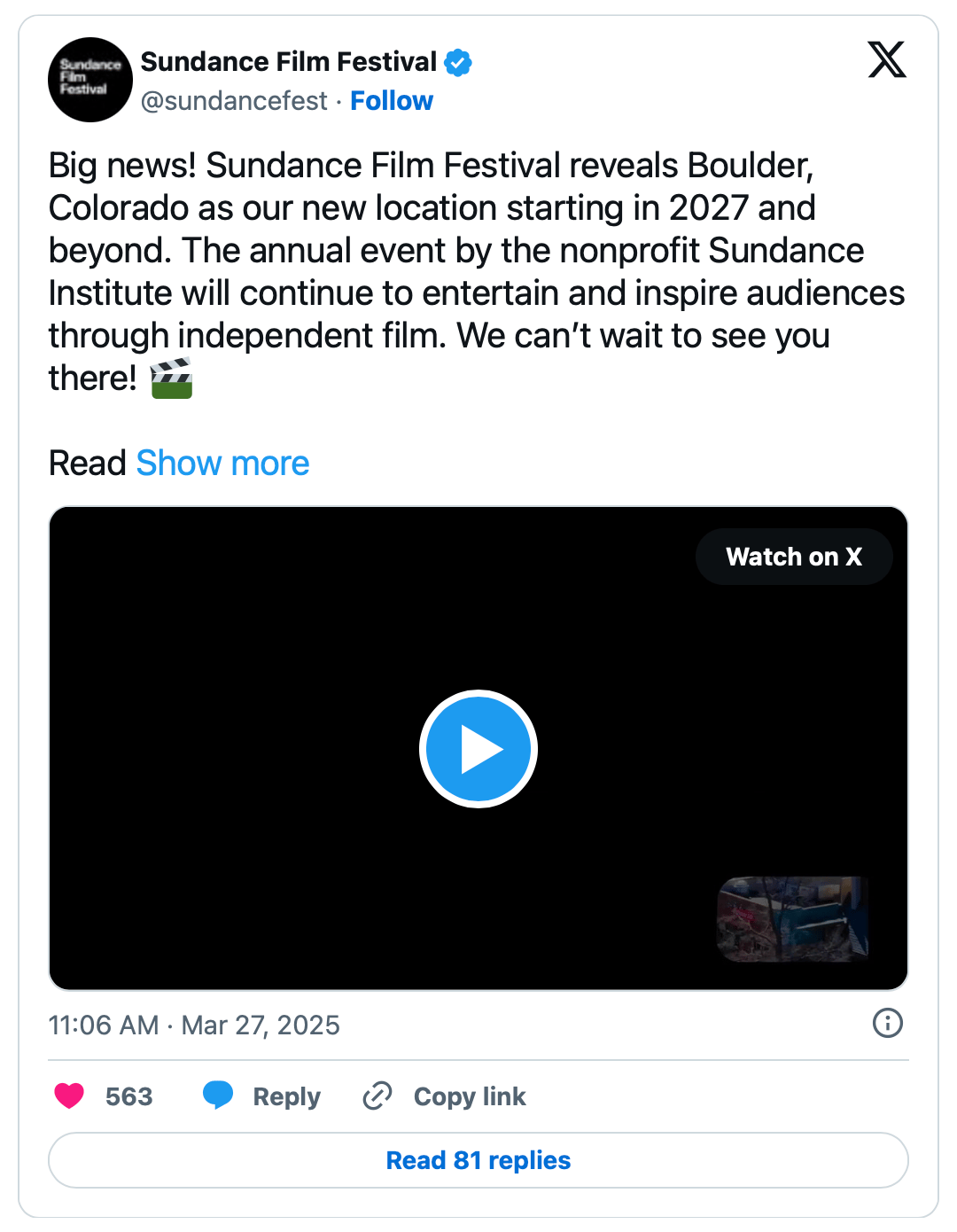 🎬🏔️ Goodbye, Park City! The iconic Sundance Film Festival is ditching its Utah home after 40+ years for Boulder, Colorado starting in 2027. The festival explicitly cited affordability concerns for filmmakers and attendees as one of the main reasons for the switch. It’s another sign of the growing financial pressures currently reshaping the indie film world, where skyrocketing costs have made premiere festivals increasingly inaccessible to emerging talent. Some of Boulder’s perks: a walkable downtown, proximity to Denver’s international airport, a vibrant arts scene, and—crucially—pre-negotiated hotel rates locked in for the next decade. The festival will take place around Pearl Street Mall and University of Colorado venues—likely an answer to major headaches in recent years, including lost Park City venues and pricey conversions of non-theater spaces. In short: new mountains, same mission.