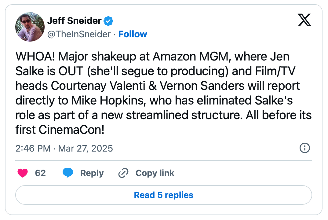 🎬⚙️ Amazon MGM Studios head Jen Salke is stepping down. The studio head is reportedly leaving to start her own production company with a first-look deal. Rather than replace her, Amazon is simplifying its structure—film chief Courtenay Valenti and TV head Vernon Sanders will now report directly to Prime Video boss Mike Hopkins. The change comes as Amazon finalizes greater control of the James Bond franchise and prepares for its CinemaCon debut. During her six years at the helm, Salke oversaw major projects including the $465M ‘Rings of Power,’ ‘Fallout,’ ‘Reacher,’ and ‘Saltburn.’