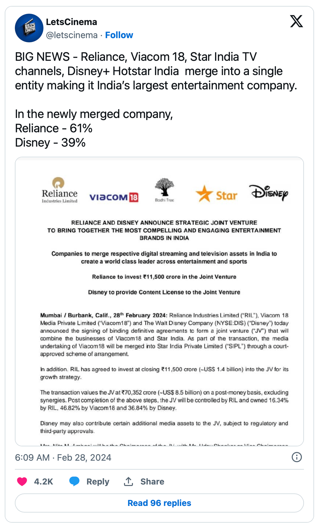 🎬📱Disney and Reliance’s $8.5B Power Move: Disney and Reliance Industries have stitched together an $8.5B deal, merging their streaming and TV might into one colossal entity. If you’re wondering who Reliance is, Reliance Industries is India’s largest private sector juggernaut. Though they have a hand in many industries, Reliance has an enormous impact on digital entertainment in India and around the world, with a network including 60 TV channels and the JioCinema streaming platform. This joint venture’s a big deal for Disney, giving it a much-needed boost to win back subscribers and take on global competitors like Netflix. Disney had been facing challenges since acquiring Star India back in 2019. The newly merged entity will combine shows, movies and sports under one roof, aiming to wow 750M viewers in India and the Indian diaspora, which remains the world’s most populous market.