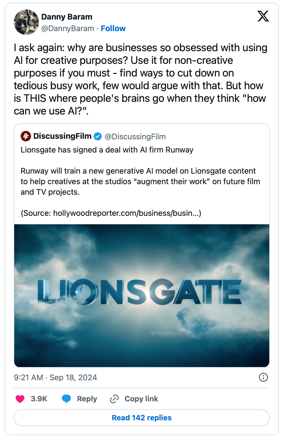 🎬🤖 Lionsgate's taking a big leap into AI territory. The studio behind 'John Wick' and 'The Hunger Games' is partnering with tech company Runway to create a custom AI model based on Lionsgate's massive 20,000-title library. Their goal? To generate "cinematic video" that filmmakers can customize, streamlining everything from storyboarding to special effects, potentially making Michael Bay's explosions look like pop rocks. Lionsgate Vice Chair Michael Burns is bullish on the tech, seeing it as a way to "develop cutting-edge, capital-efficient content creation opportunities." In plain English, that means using AI to potentially cut costs and boost creativity. They're also eyeing licensing the tech to other studios—a novel way to monetize their library. By training the AI exclusively on their own catalog, Lionsgate also sidesteps the thorny copyright issues plaguing other AI ventures. It's a savvy move, but as Hollywood wrestles with AI's role in the industry, not everyone's thrilled. Critics are side-eyeing the obsession with AI in creative spaces, arguing it might be better suited for behind-the-scenes, administrative tasks.