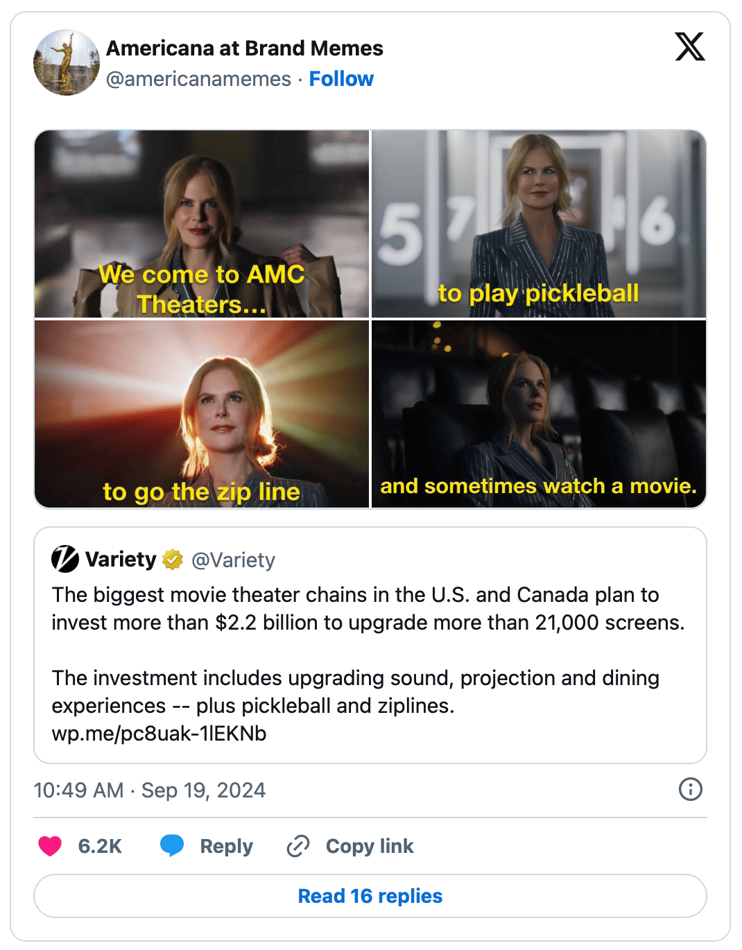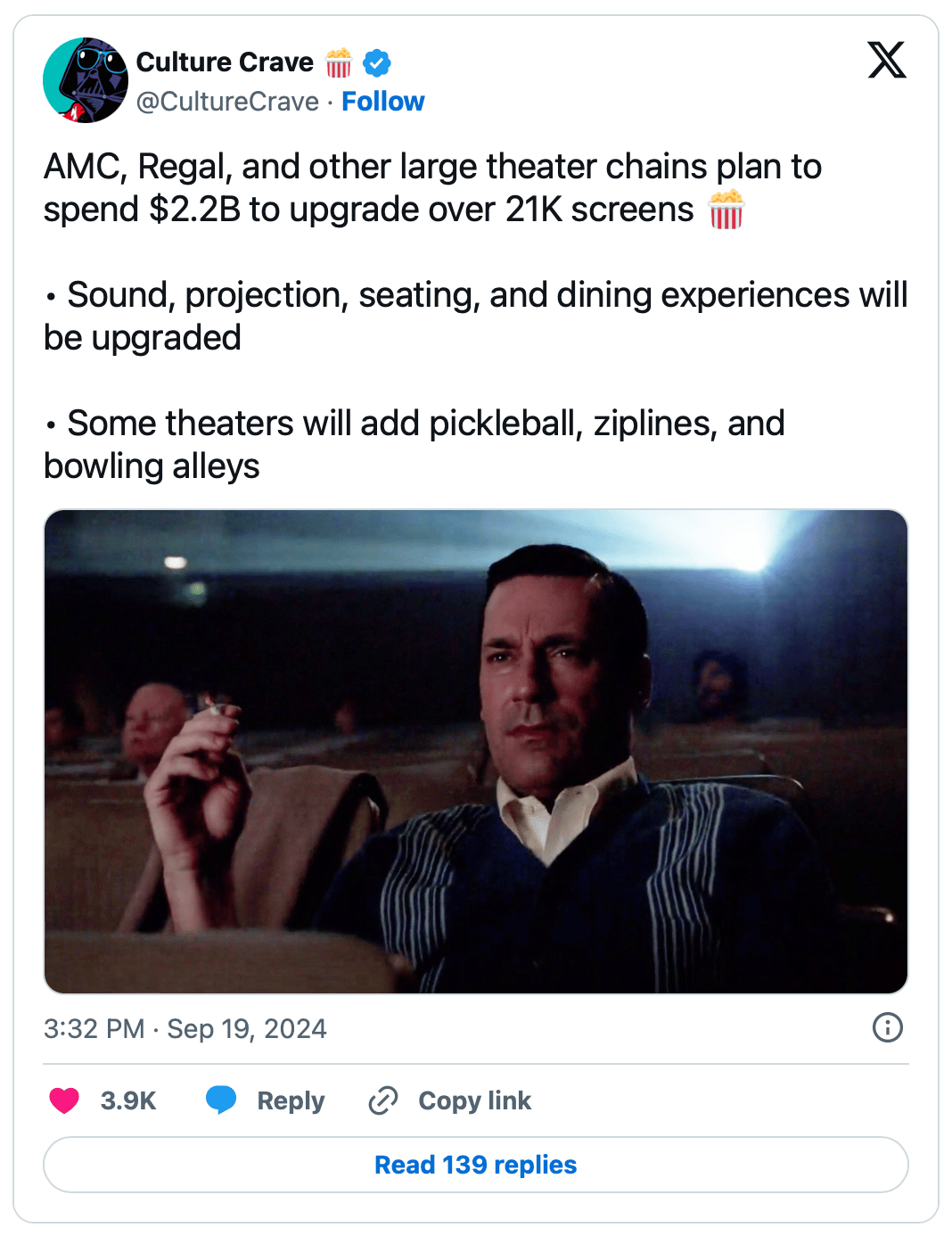 🎬💰 Cinema's getting a $2.2B facelift. Major chains like AMC, Regal, and Cinemark are betting big on a box office comeback, investing billions over the next three years to spruce up their theaters. The plan includes cutting-edge laser projectors, premium seating, and enhanced concessions—all aimed at reinvigorating the moviegoing experience post-Covid. Some locations are going all out with pickleball courts, ziplines, and bowling alleys, transforming theaters into entertainment hubs. NATO (National Association of Theatre Owners) and its president Michael O'Leary are crossing fingers for a "normal" 2025, the industry's first in five years. With 1,600+ locations and 67% of North American screens involved, it's a calculated bet that "if you upgrade it, they will come."