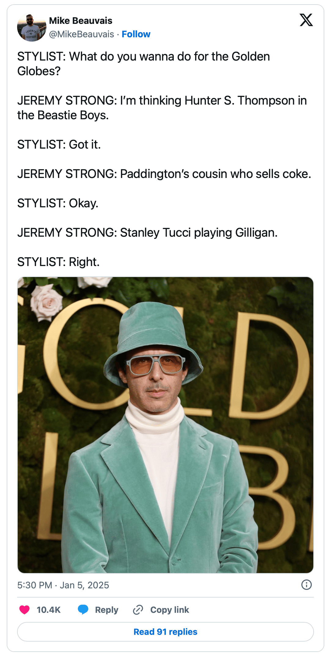 👋 Good morning! The Golden Globes red carpet saw double last night when two contest-winning lookalikes crashed Hollywood's party. Max Braunstein (who won his Glen Powell contest for $5 and free queso) and Miles Mitchell (champion of 2,600 Timothée twins) showed up with cheeky signs while their famous doppelgangers competed for Best Actor inside. More on the Golden Globes below. 👇