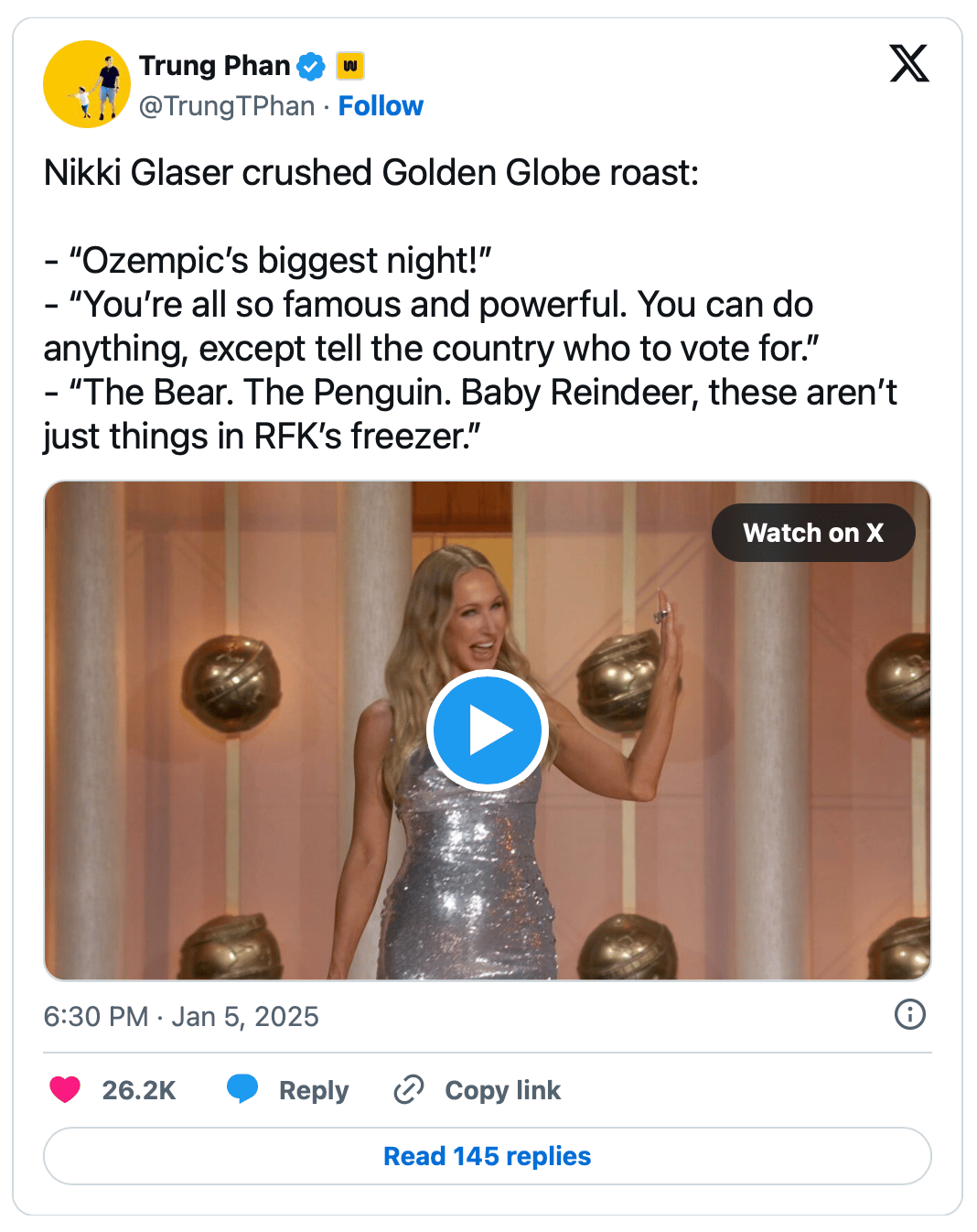 Comedian Nikki Glaser made history as the show's first solo female host. Social media viewers immediately took to X to praise her performance, with many contrasting it to Jo Koy's controversial hosting stint in 2024. Glaser delivered a monologue that had viewers calling for her to "host every event."
