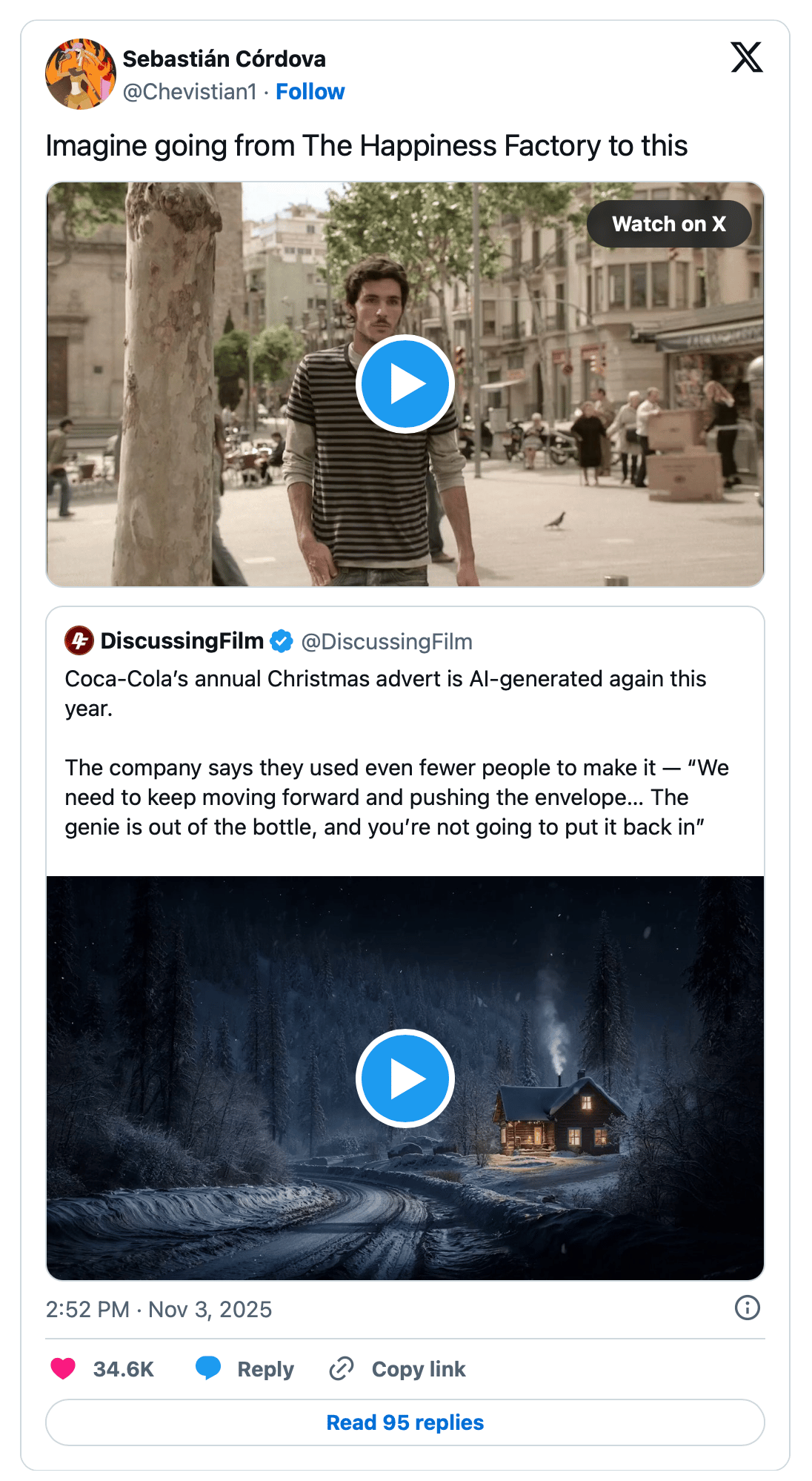 š„¤ Coca-Cola's controversial AI holiday ad is back for round two. Remember last year's AI-generated āHolidays Are Comingā spot that didn't exactly go over well with the creative community? Coke's back with another synthetic commercial from LA-based AI studio Secret Level, this time featuring animated animals instead of the uncanny valley humans. The math on this one stings: what normally takes 50+ people to produce needed just 20. Secret Level and Coke execs insist brands will ultimately spend the same budgets to create more ads rather than pocket the savings (we'll see about that). Last year's backlash didn't hurt viewershipāthe ad racked up billions of impressions. Coke's AI chief says "the genie is out of the bottle," and they're already eyeing AI ads for March Madness and beyond.