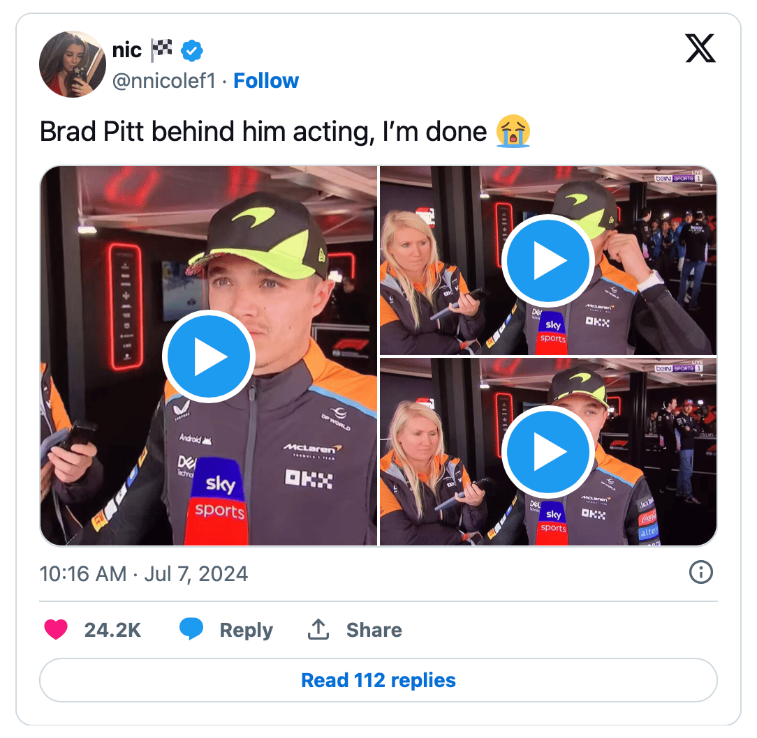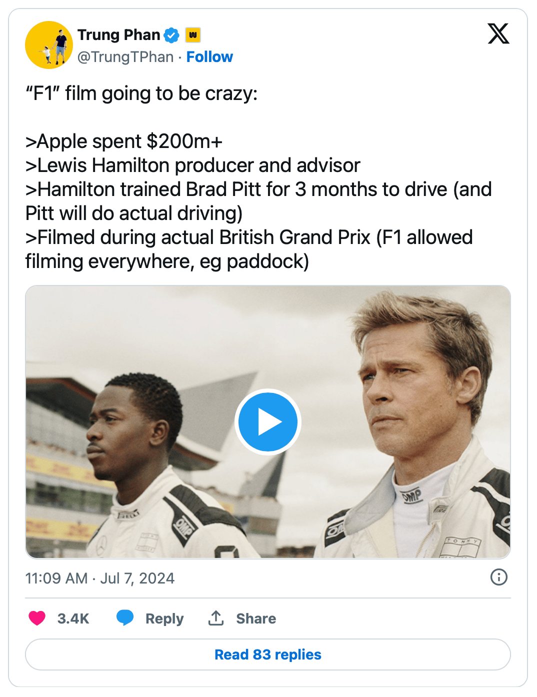 🏎️💰 Apple TV+ is going full throttle on Formula 1's skyrocketing popularity. With F1 fever at an all-time high thanks to ‘Drive to Survive,’ Apple's betting over $200M on a high-octane Brad Pitt-led film that's pulling out all the stops and cutting no corners: They've enlisted ‘Top Gun: Maverick’ director Joseph Kosinski and racing royalty Lewis Hamilton as producer. Hamilton even put Brad Pitt through a grueling three-month racing boot camp, ensuring authenticity down to the last gear shift. The cherry on top? The production had unprecedented access to film during the British Grand Prix, turning their production into a de facto 11th racing team. By embedding themselves in the heart of F1, from paddock to pit lane, Apple's not just making a movie – they're capturing the sport's essence. It's a bold strategy to convert F1's surge in popularity into streaming gold. Watch the trailer here. 👈👀