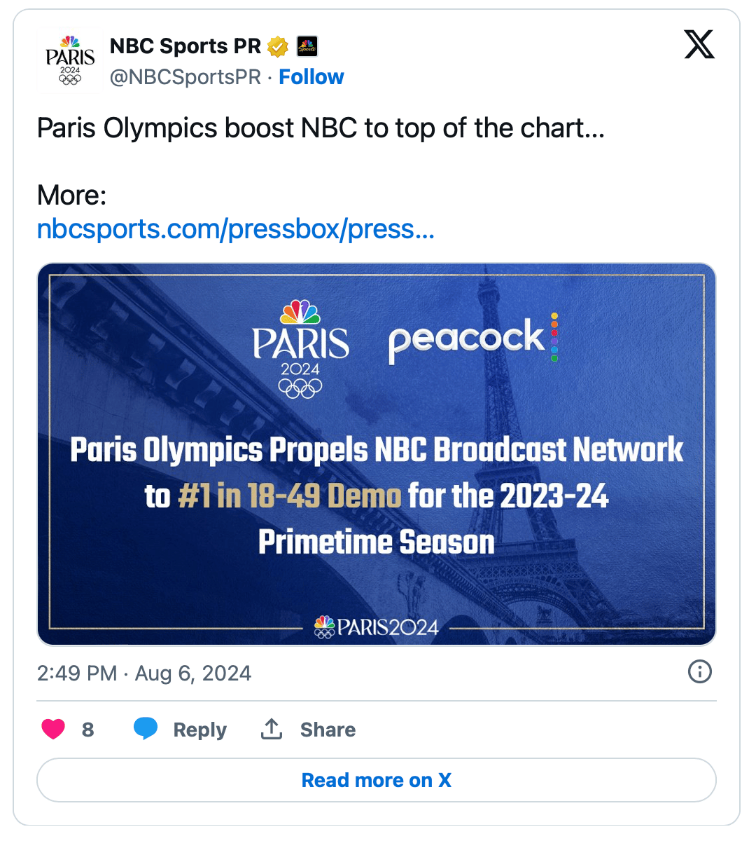 The 2024 Paris Olympics have sprinted past viewership records, leaving previous Games in the dust. NBCUniversal's multi-platform strategy is paying off big time: on the streaming front, viewers have streamed an impressive 17B minutes of content—more than all previous Games combined. Peacock is flexing hard, offering coverage of all 329 medal events. Meanwhile, NBC maintains its stronghold in primetime ratings, positioning itself to win the Adults 18-49 demographic for the season. NBCUniversal's scoring an average of 32.6M viewers across combined live broadcast and primetime coverage—a 79% leap from Tokyo. Looks like NBCUniversal has couch potatoes and cord-cutters alike going for the gold in binge-watching.