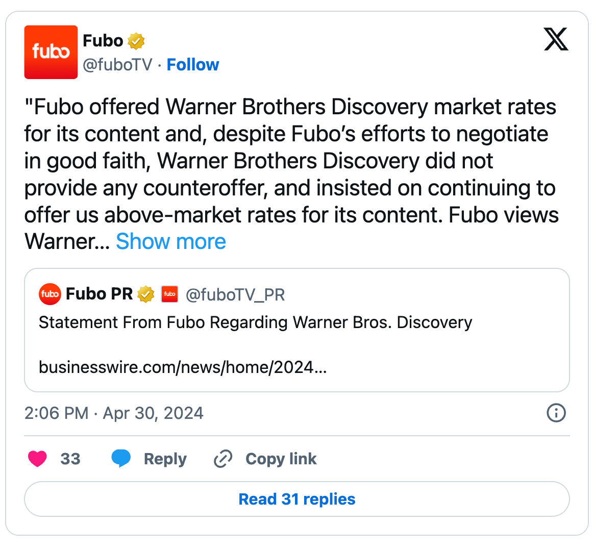 🏈📺 Fubo Ditches Warner Bros. Discovery Deal: FuboTV, the sports-focused streaming service, has just pulled the plug on its content deal with Warner Bros. Discovery, citing "abuse of massive market power" and a lack of "good faith negotiations." They claim Warner Bros. insisted on offering Fubo above-market rates for its popular networks like Discovery, HGTV, and Food Network, not to mention the coveted sports content from TNT, TBS, and truTV. Fubo argued that this stance not only hiked prices for consumers but also stifled choice by bundling sports with other content, contrary to consumer interests in more tailored, cost-effective packages. Warner Bros. Discovery, for its part, says it’s still open to working things out. But with Fubo yanking their networks and whispers of legal action in the air, the industry waits to see what happens.