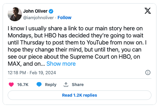 ⏸️📹 HBO Puts a Pause on YouTube: HBO's pulling the plug on next-day YouTube freebies for ‘Last Week Tonight With John Oliver.’ Starting S11, clips will take a scenic four-day detour before hitting YouTube, all in a ploy to nudge viewers towards Max's subscription, where the laughter starts at $9.99 a month. Oliver himself aired his "wish-they'd-rethink-this" thoughts on X, hinting at a Supreme Court piece now behind the Max paywall. As HBO aims to funnel fans to its streaming service, they're betting big on loyalty over instant gratification, hoping the move from immediate YouTube access to a delayed gratification model will have viewers flocking to Max for their weekly satire fix.