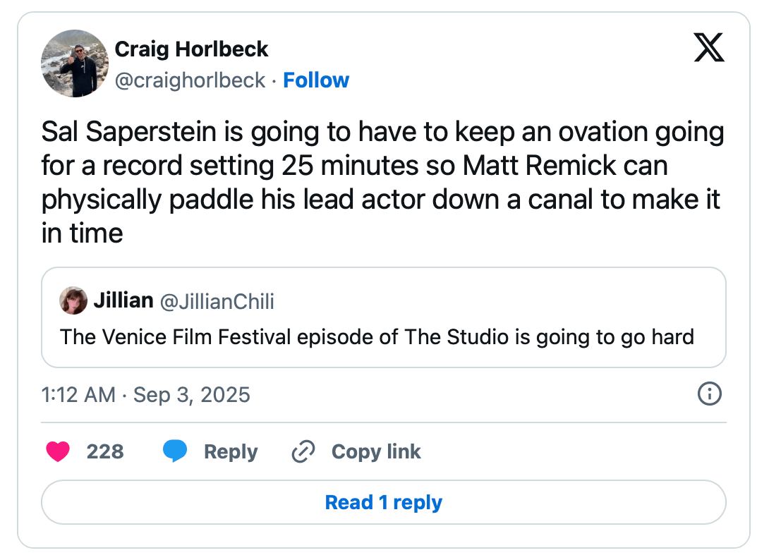 👋 Good morning! Seth Rogen executed the most obvious stealth mission in Venice Film Festival history earlier this week. The ‘Studio’ creator showed up at festival trying to blend in with the black-tie crowd, while furiously photographing everything like a tourist on his first gondola ride. Turns out he was doing undercover reconnaissance for S2. Somehow you just know those excessive standing ovations are getting roasted next season.