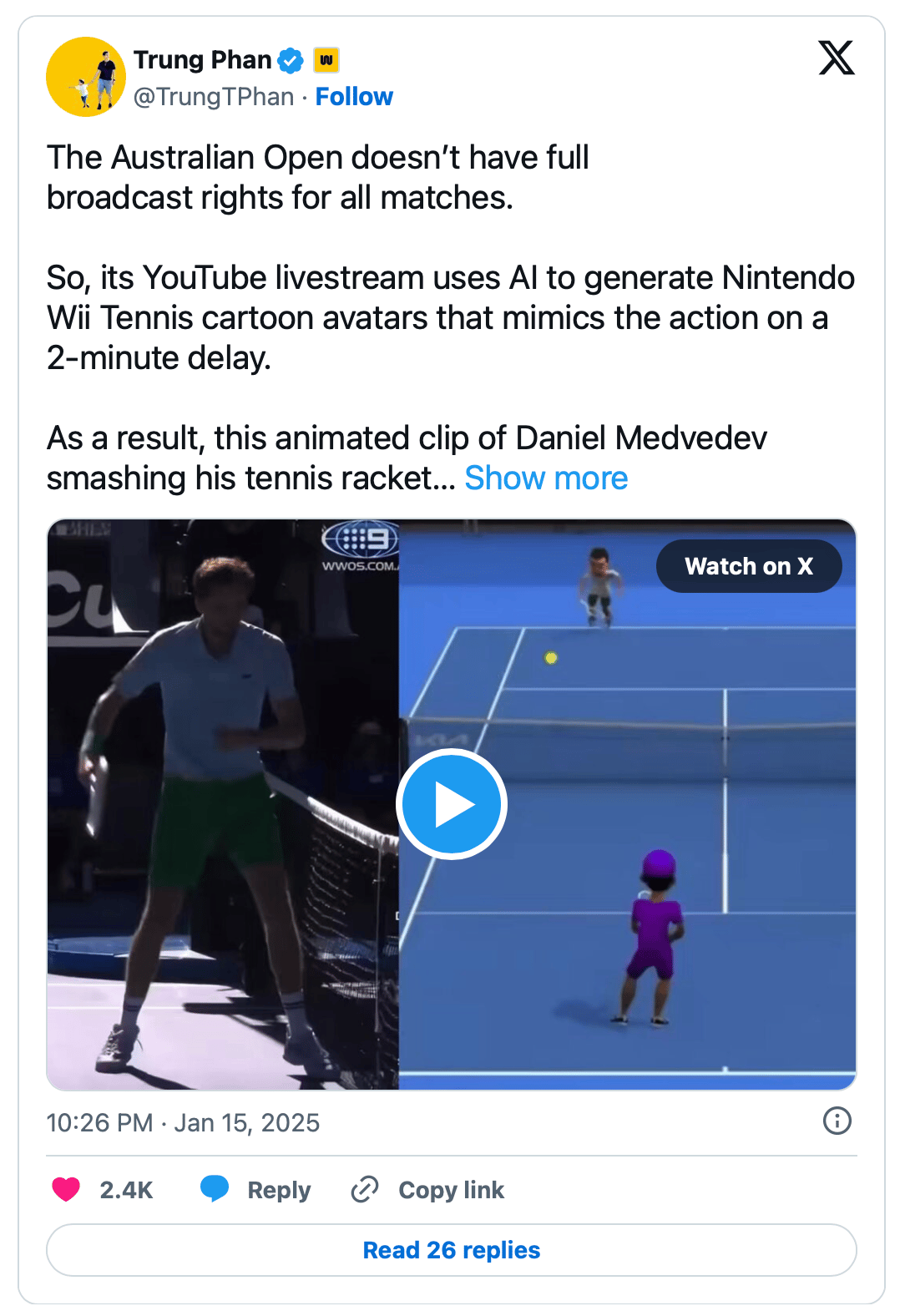 📺🎾 The Australian Open found a genius loophole in sports broadcasting. As the tournament continues through Jan. 26, Tennis Australia (the sport's national governing body) is transforming live matches into real-time computer animations on YouTube, complete with commentary and crowd roar—a clever workaround to their own broadcast restrictions. Since they've sold exclusive TV rights to networks worldwide, this gaming-style format lets them reach audiences directly through social media. The tech uses 12 cameras to create digital player avatars by tracking everything from serve motions to footwork, rendering matches with just a 2-minute delay. The experiment's paying off: after drawing 800K views for last year's men's final, this year's tournament is pulling four times more viewers. Following NFL's Simpsons-themed broadcast success and Amazon Prime's alternative Thursday Night Football streams featuring celebrity commentators, this signals a larger shift toward experimental formats. In today's fragmented media landscape, it's becoming clear: the future of sports broadcasting might be less about who owns the rights and more about who can serve up the most innovative viewing experience.