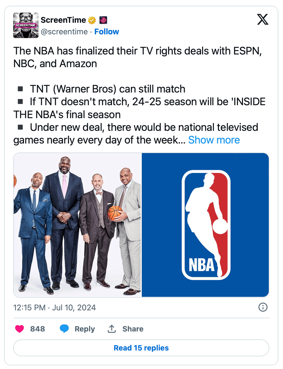 ESPN/ABC is keeping the Finals, upping their annual spend from $1.5B to $2.6B.