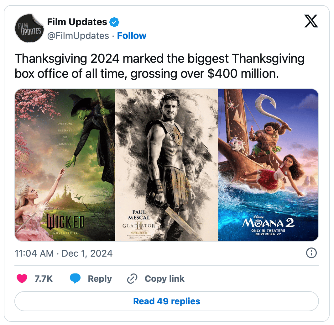 AMC set a record-breaking Thanksgiving weekend with 8.8M attendees, fueled by ‘Moana 2,’ ‘Wicked,’ and ‘Gladiator II.’ (more)