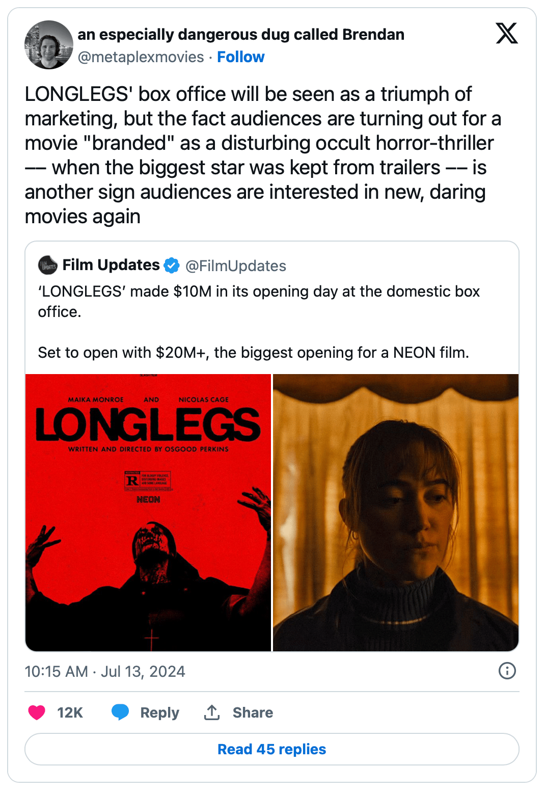 🦵 Longlegs: Neon’s Maika Monroe / Nicolas Cage horror opens with a solid $22.6M domestically. More on this in Wide Shots. 👇😏