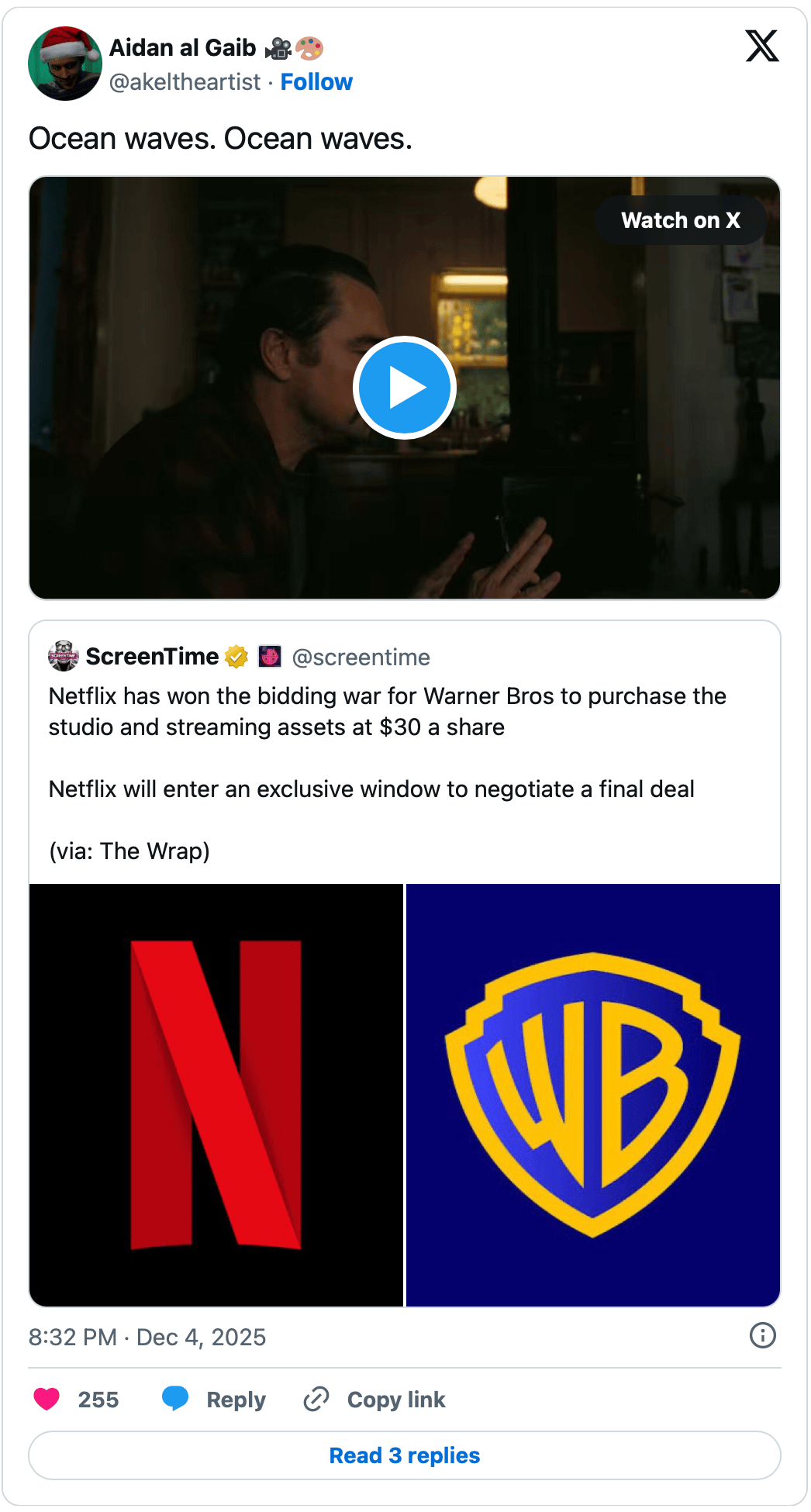 Netflix beat out Paramount Skydance and Comcast after three rounds of increasingly messy bidding. Paramount didn't go quietly, firing off two aggressive letters to CEO David Zaslav this week. The company warned a Netflix deal would likely "never close" due to regulatory issues and claimed the sales process was "tainted by management conflicts," basically alleging WBD executives were picking whichever bidder would give them the best jobs after the deal. Paramount even doubled its breakup fee to $5B to show it could get through regulators.