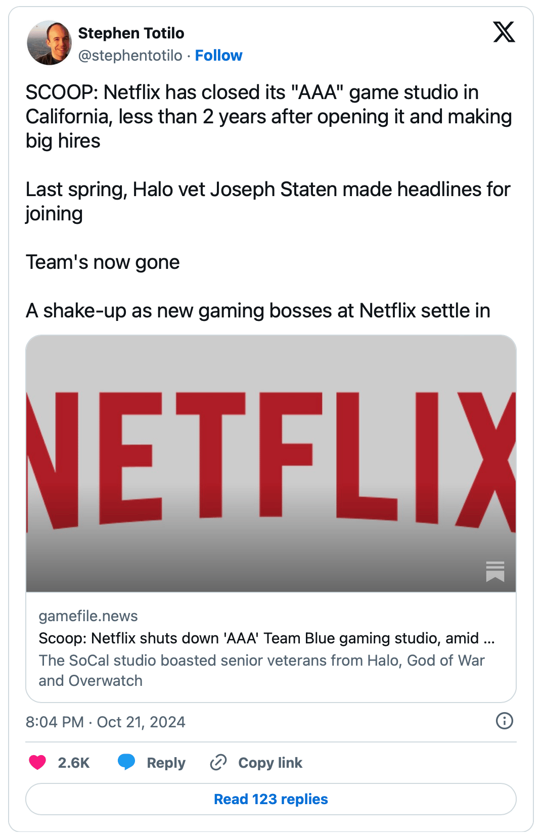 🎮📱 Netflix pulls the plug on its ambitious console gaming dreams. The studio’s shuttering its Southern California "Team Blue" studio that was meant to create blockbuster-scale video games (known as "AAA" titles—think the gaming equivalent of Marvel movies). Despite initially poaching top talent from gaming giants like ‘Overwatch’ and ‘God of War,’ the streaming giant is now showing its cards: mobile gaming is the play, not $100M+ console epics. Since diving into gaming in 2021, Netflix has built an empire of over 100 mobile titles, with plans to churn out monthly games based on hits like ‘Squid Game’ and ‘Rebel Moon.’ This closure, coming after a recent leadership shuffle in its gaming division, signals Netflix is doubling down on what's working—turning its streaming hits into pocket-sized entertainment rather than competing with PlayStation or Xbox.