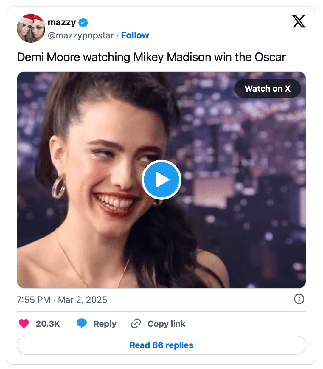 Best Actress (Mikey Madison, pulling off one of the night's biggest upsets against frontrunner Demi Moore)