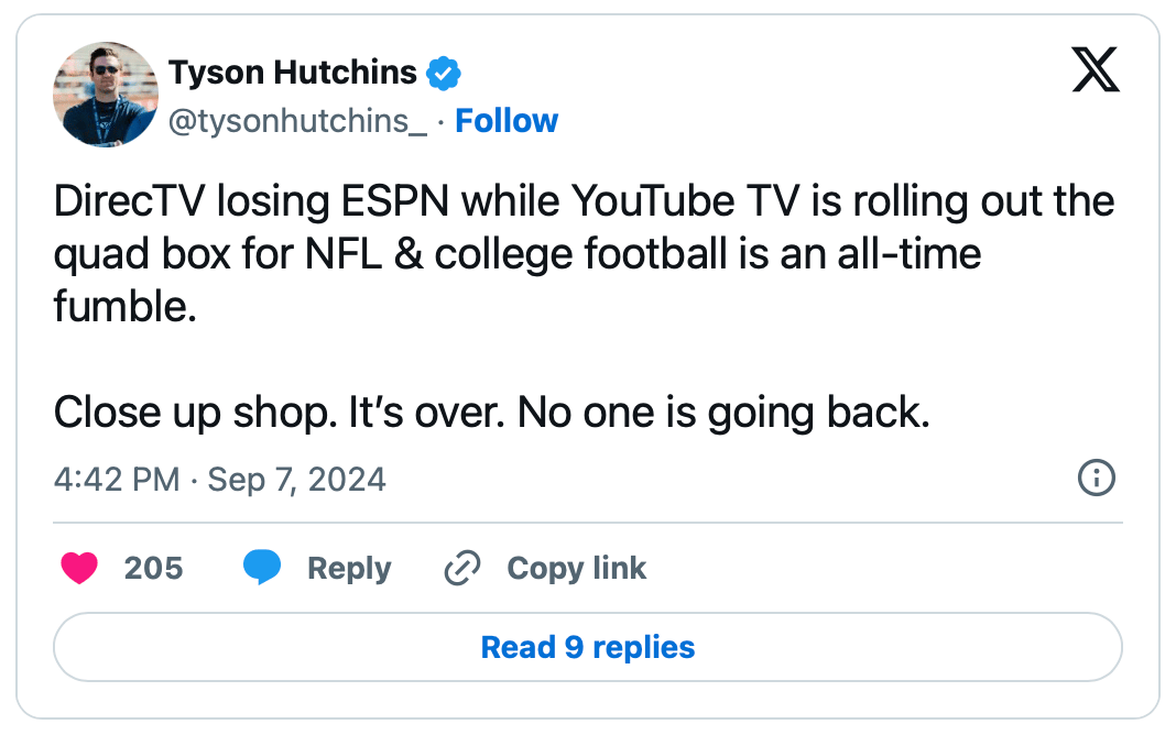📺🏈 As the Disney-DirecTV standoff enters week two, viewers are flocking to services like YouTube TV. The standoff has left 11.3M viewers without ESPN and ABC. Monday Night Football fans scrambled for alternatives, and even last night’s presidential debate got caught in the crossfire when DirecTV rejected Disney's temporary ABC feed offer. As the blackout drags on, streaming services like YouTube TV are seeing a subscriber surge, with industry insiders warning these viewers might never return to traditional TV. This dispute is accelerating the "cord-cutting" trend that's seen 30M+ ditch regular TV packages since 2015. DirecTV's push for smaller, cheaper bundles clashes with Disney's demand for wider channel distribution, all while viewers explore new watching options. It's not just about missed games or shows anymore—with each passing day, this standoff nudges more viewers towards streaming, potentially changing how we consume television for good.