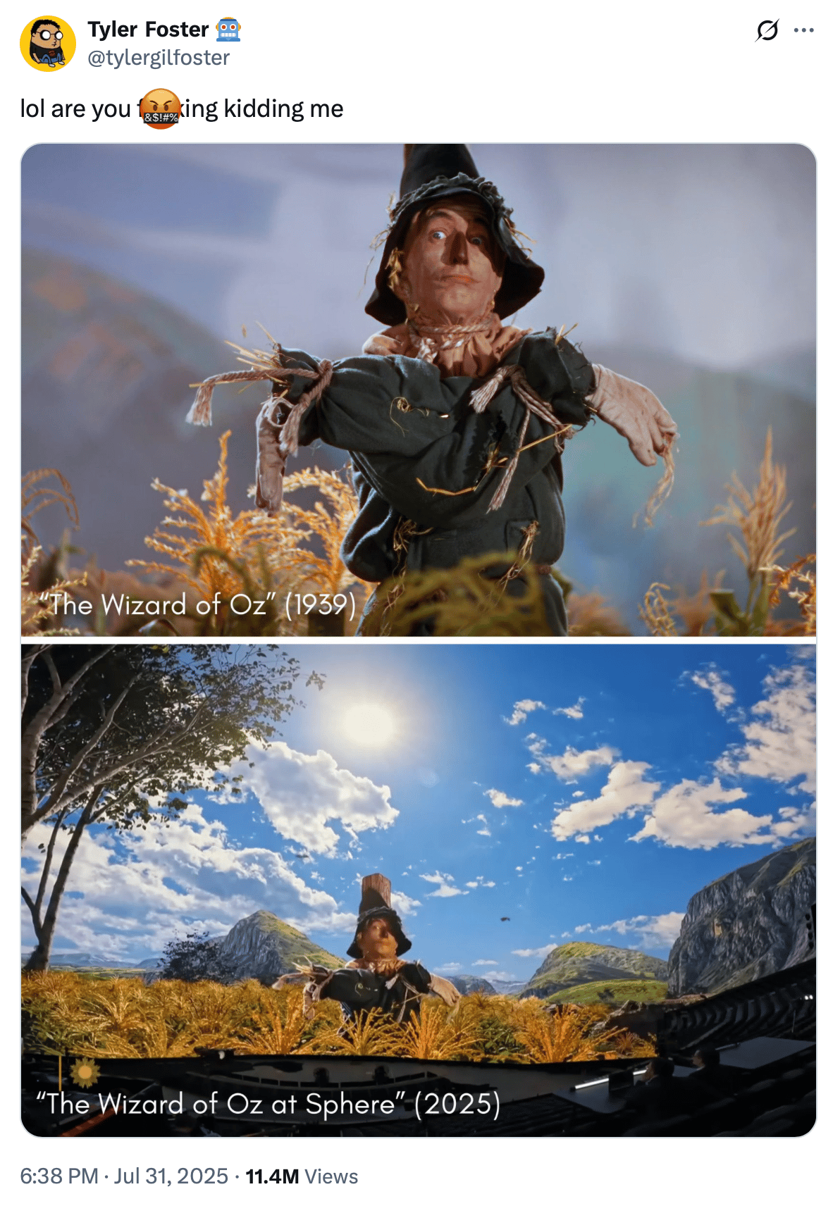 🌈 Film fans aren’t too happy about Vegas's AI-altered 'Wizard of Oz.' The Sphere's planning to screen a heavily modified version of the 1939 classic, which cuts 30 minutes from the runtime by using AI to smooth over scene transitions (necessary because the venue's wraparound screen doesn't handle abrupt cuts well). The AI also upscales the film to 16K, expands the original 4:3 format to fill the massive curved display, and even inserts digital "extra" actors into scenes that the original cast never performed or consented to. Critics erupted when Turner Classic Movies host Ben Mankiewicz defended it as bringing classics to new audiences, with many calling it vandalism and accusing the venue of mangling the film. At $100+ a ticket, plenty of people think it's just a cash grab that trashes the film’s legacy and artistic integrity.