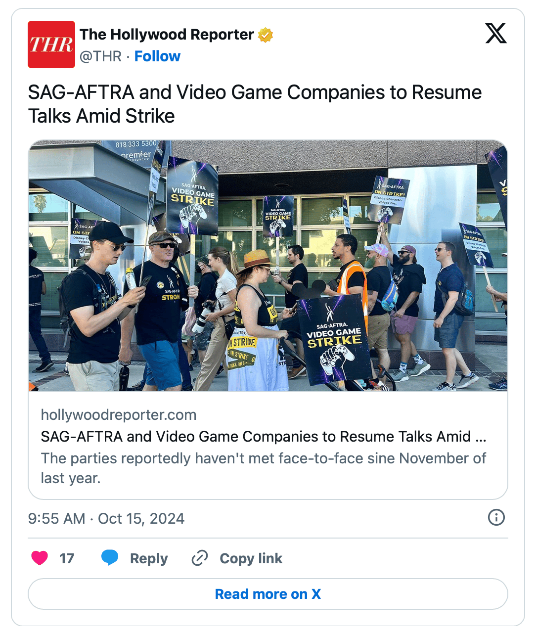 🎭🎮 SAG-AFTRA and video game publishers are set to resume contract talks on Oct. 23—their first sit-down since Nov. 2023. The actors' strike, which kicked off in July, has most issues sorted (24 out of 25 proposals agreed upon). This final push involves major players like Activision and Disney. The union recently added Riot Games' ‘League of Legends’ to its blocked titles list, citing unfair labor practices by Formosa Interactive. The union’s move aims to level up public awareness and pressure companies. The endgame? Rewriting the code for voice actors' rights—leveling up paychecks, setting boundaries on AI voice farming, and boosting motion capture safety stats.