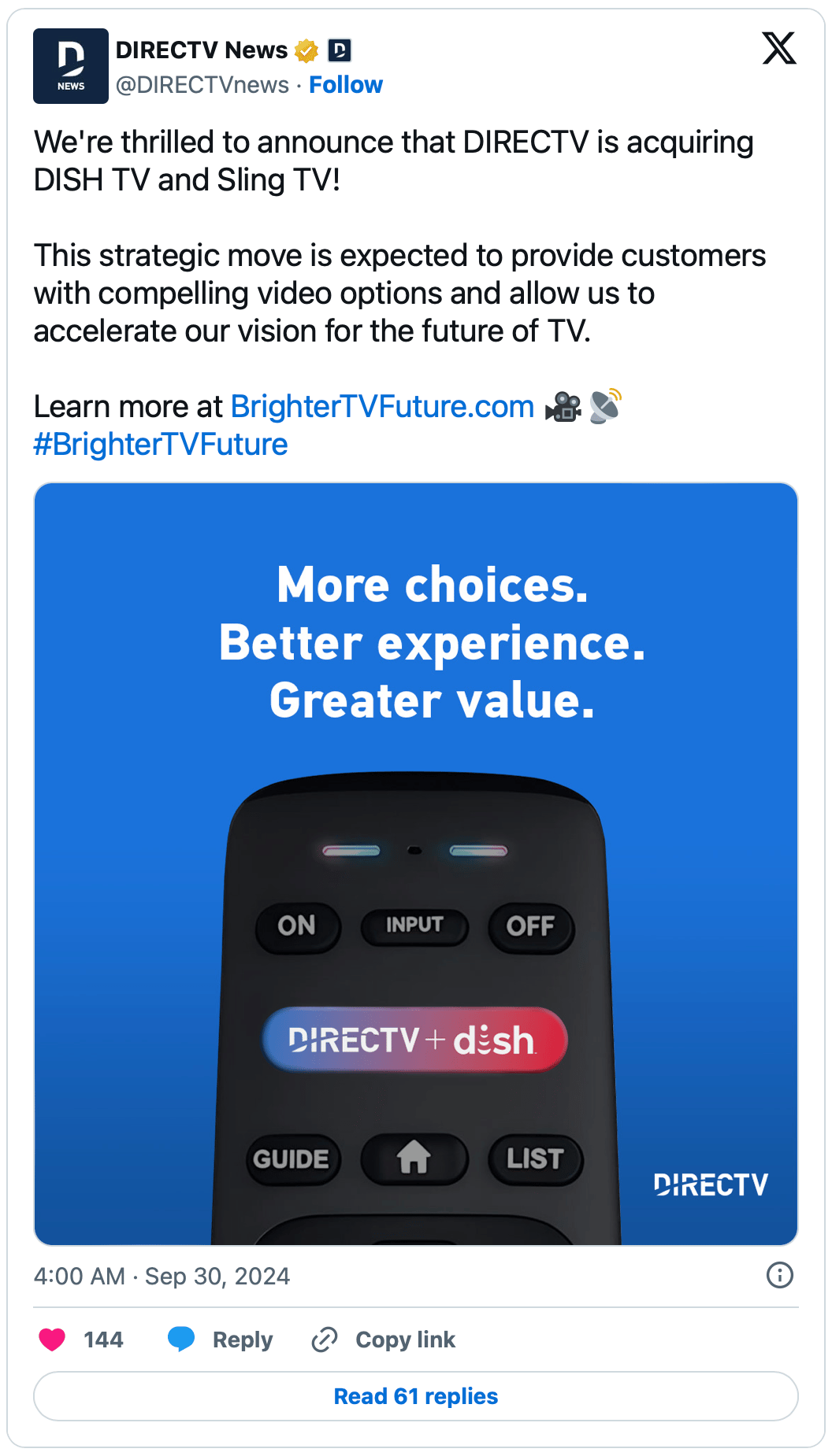 📡🤝 DISH and DIRECTV are tying the knot in a deal that's more lifeline than love story. DIRECTV's scooping up DISH for a symbolic $1, but don't be fooled—they're also shouldering $9.8B of DISH's debt. This merger makes them the biggest TV package seller in America with 18M subscribers, down 63% from its 2016 peak. It's a chess move in a game where streaming is king: the new DIRECTV gains leverage against content giants like Disney in carriage negotiations. Meanwhile, AT&T's cutting its losses when it comes to TV, selling its 70% DIRECTV stake to private equity firm TPG for $7.6B—an 80% loss on its 2015 investment. With TPG in charge, you can bet they'll be cutting costs and playing hardball with Hollywood studios to save money.