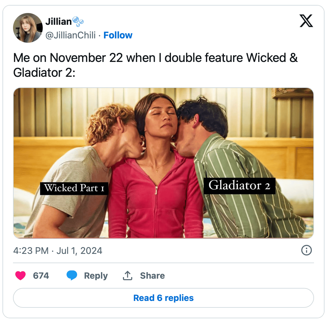 👋 Good morning! A showdown is brewing that rivals last year’s ‘Barbenheimer’ frenzy. Earlier this week, Universal Pictures announced that ‘Wicked’ will now hit theaters on November 22—the same day as Ridley Scott’s highly anticipated sequel, ‘Gladiator II.’ The memes are already flying, with fans trying to coin the next big portmanteau.