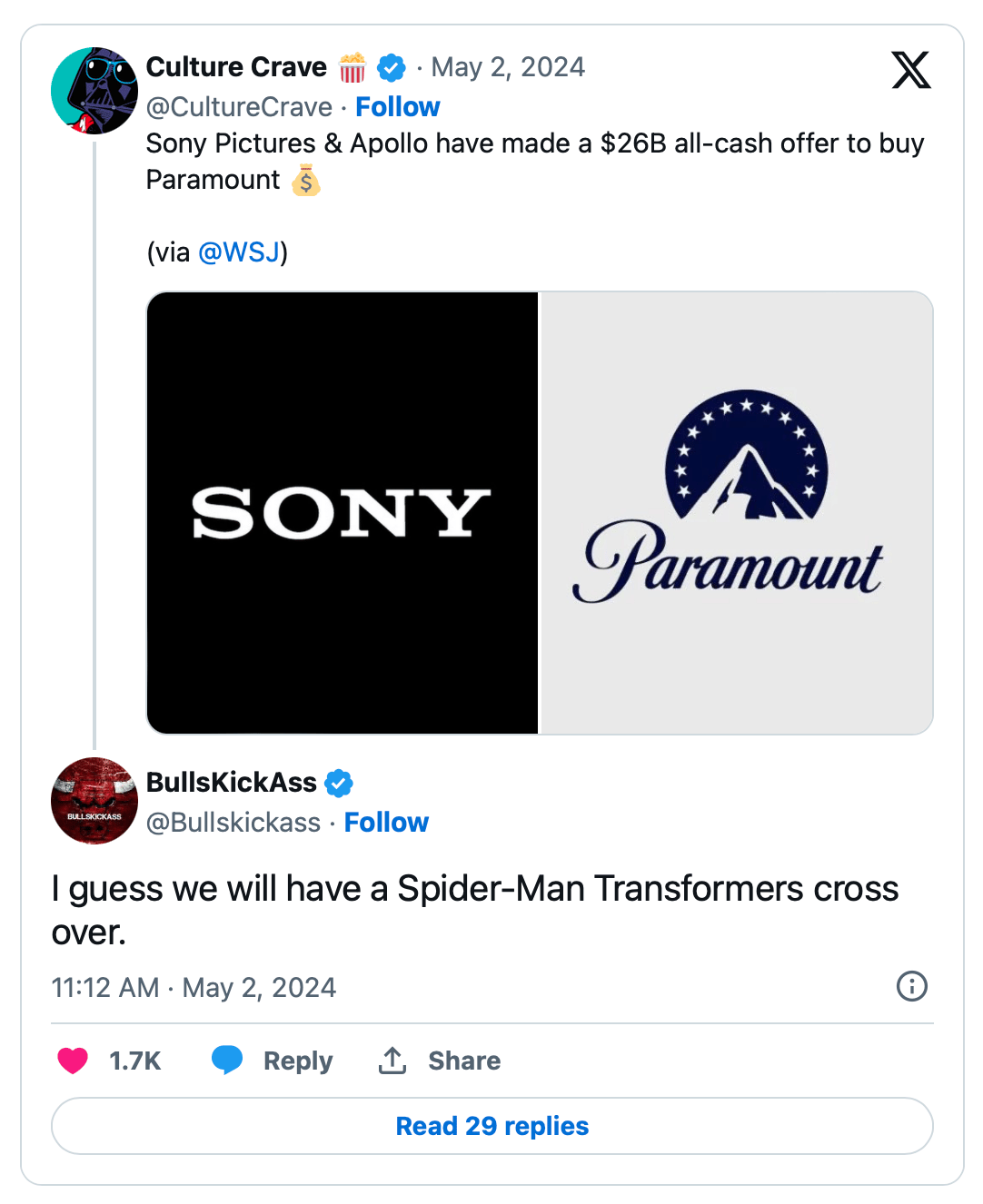 🎬💰 Sony and Apollo's $26B Bid: In case you haven’t been following the Paramount M&A saga, the media giant has been exploring potential mergers and acquisitions, with a focus on exclusive negotiations with David Ellison’s Skydance Media. The latest? Sony Pictures and Apollo have crashed the party with a jaw-dropping $26B all-cash offer to take Paramount private. This bombshell landed on Paramount’s desk Wednesday night, days before their exclusive talks with Skydance wrap up today, May 3rd. The Sony-Apollo bid is a premium over Paramount’s current enterprise value, but controlling shareholder Shari Redstone seems to have her heart set on a deal with David Ellison’s Skydance. Paramount's shares skyrocketed 13% on the news. With the clock ticking, the industry is waiting to see if this unexpected offer will sway Paramount’s final decision.