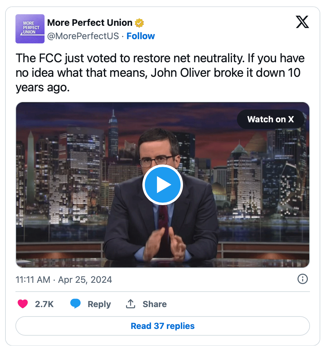 🎬🌐 Net Neutrality’s Back, Streamers Breathe Easier: Net neutrality is making its grand re-entrance, courtesy of the FCC. As of April 25, broadband behemoths like Comcast and Verizon have to keep their traffic throttling in check, ensuring a smooth streaming experience for all. This means no more creating “internet fast lanes” that could have had Netflix and Hulu viewers staring at buffering icons. Cue the celebrations from binge-watchers everywhere. While the move is aimed at consumer protection, it’s also sparked fierce backlash from ISPs, with a storm of lawsuits anticipated this summer. The FCC’s push for net-neutrality reflects their intent to treat broadband as an essential service (like water and power). On the flip side ISPs argue that it can stifle innovation and investment in network infrastructure, potentially leading to higher consumer costs and a one-size-fits-all approach that limits specialized services. Whether this reboot of net neutrality will stick or get stuck in the courts is anyone’s guess.