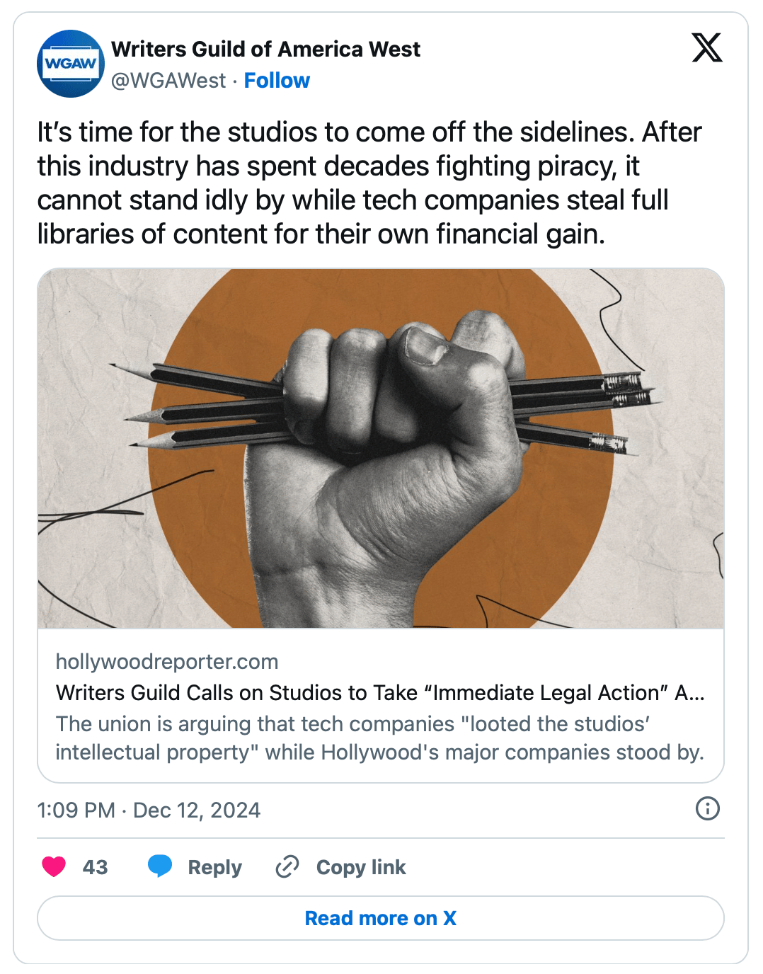 🤖📝 The Writers Guild of America is calling out major studios for sitting idle while tech giants feast on their intellectual property. A bombshell Atlantic investigation published in November revealed that over 53,000 movies and 85,000 TV episodes were used without permission to train AI systems at Apple, Meta, and Salesforce. Yesterday, the WGA sent a scathing letter to studio CEOs claiming this violation of their basic agreement has harmed writers whose work was essentially “looted” to create potential AI competitors. The timing is particularly charged, as these systems could theoretically generate content that competes with union writers. Despite the gravity of these allegations, major players like Paramount and Warner Bros. Discovery are keeping mum.