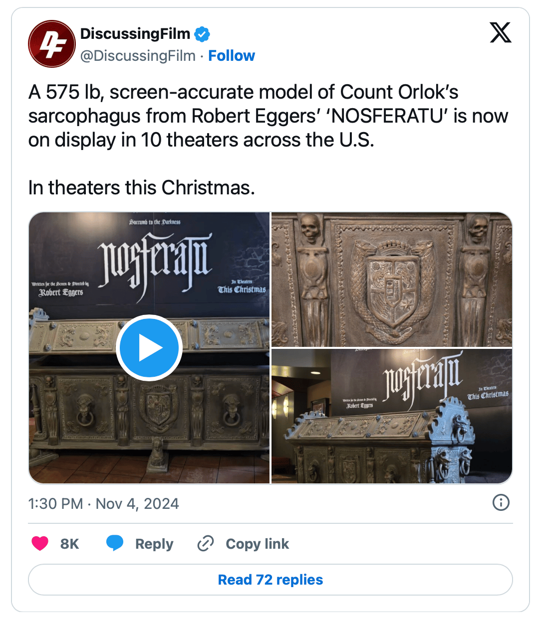 🔪 Terrifier 3: $1.47M domestic weekend (-54%), $53.3M domestic total. Horror threequel still adding to impressive cume.