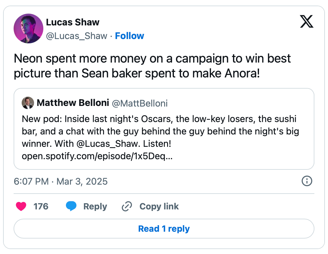 💰🏆 Best Picture comes with an $18M price tag. Neon CEO Tom Quinn revealed they spent three times ‘Anora's’ modest $6M production budget on its Oscar campaign—approximately $18M—to secure this year's Best Picture win. While most studios have gone digital, Neon doubled down on old-school tactics, shipping physical DVD screeners to Academy voters and creating buzzy unconventional moments like a pop-up merch sale from a tow truck. Quinn's reasoning: These moments help "position the film" and signal to voters that "we absolutely care." This isn't Neon's first rodeo—they previously shelled out $20M to propel ‘Parasite’ to Oscar glory. Quinn noted they spotted ‘Anora’ as an awards contender immediately after its Cannes premiere, strategically targeting six Oscar nominations based on test screening scores comparable to previous Palm d'Or winners. The campaign was a "big bet," but the strategy delivered exactly what they wanted: five Oscar wins from six nominations.