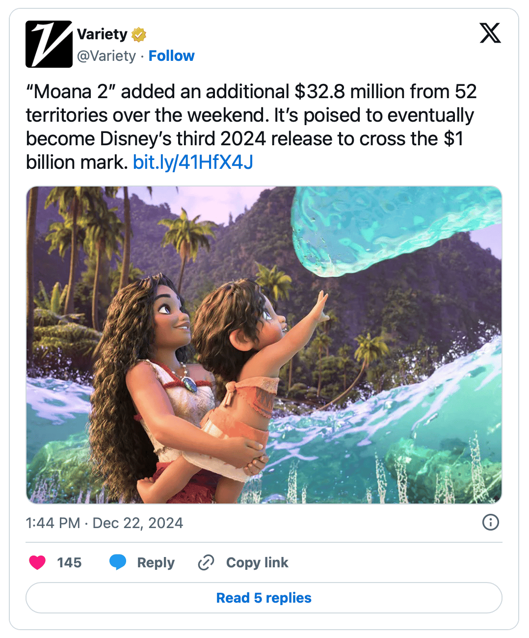 🌊 Moana 2: $13.1M domestic weekend (-51%), $359.1M domestic total, $790.2M global. Disney's animated sequel sailing toward $1B worldwide milestone.