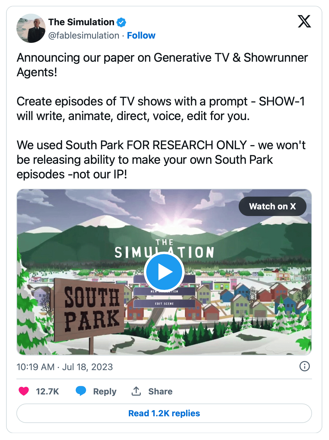 📺🤖 A new AI app lets users easily create their own TV episodes. Yup, you heard that right. Fabel Studios has just unveiled their new app Showrunner, now in Alpha. With simple prompts, viewers can choose characters, storylines, and shot types to generate personalized content. Showrunner's already making waves— it was tested with AI-created ‘South Park’ episodes that racked up a whopping 8M views on X. While currently limited in complexity, the app’s potential is clear. CEO Edward Saatchi envisions Showrunner as the "Netflix of AI," igniting creativity and redefining TV production by enabling interactive and user-driven content creation.