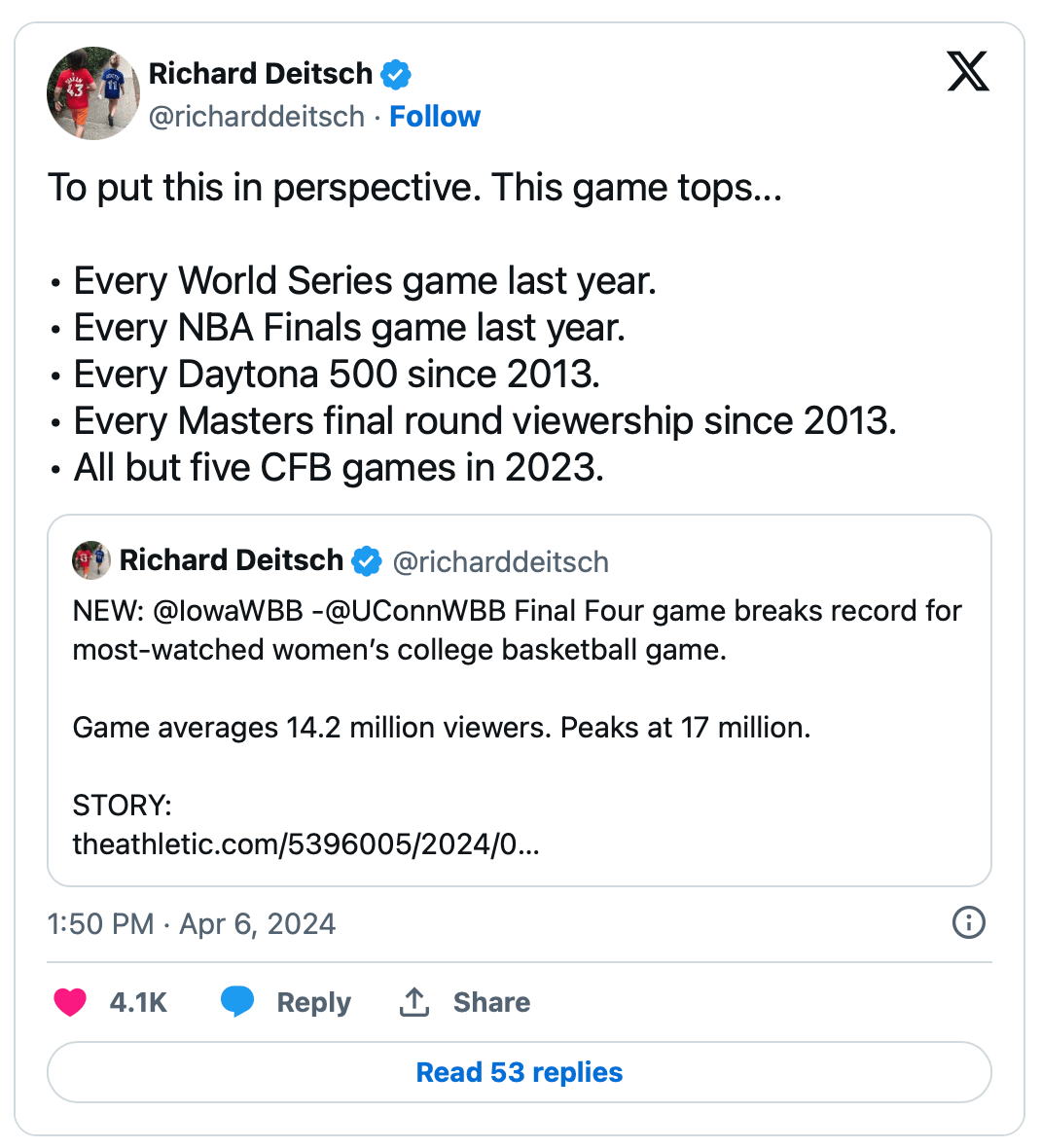 NCAA Women’s Basketball Sets New Heights: The NCAA Women's Championship game between Iowa and South Carolina fetched an astounding 18.9M viewers, making it the most-watched basketball game on ESPN — ever. This historic viewership not only surpassed any men’s or women’s basketball game from the past five years but also stood out as ESPN's top annual event since 2019, football excluded.