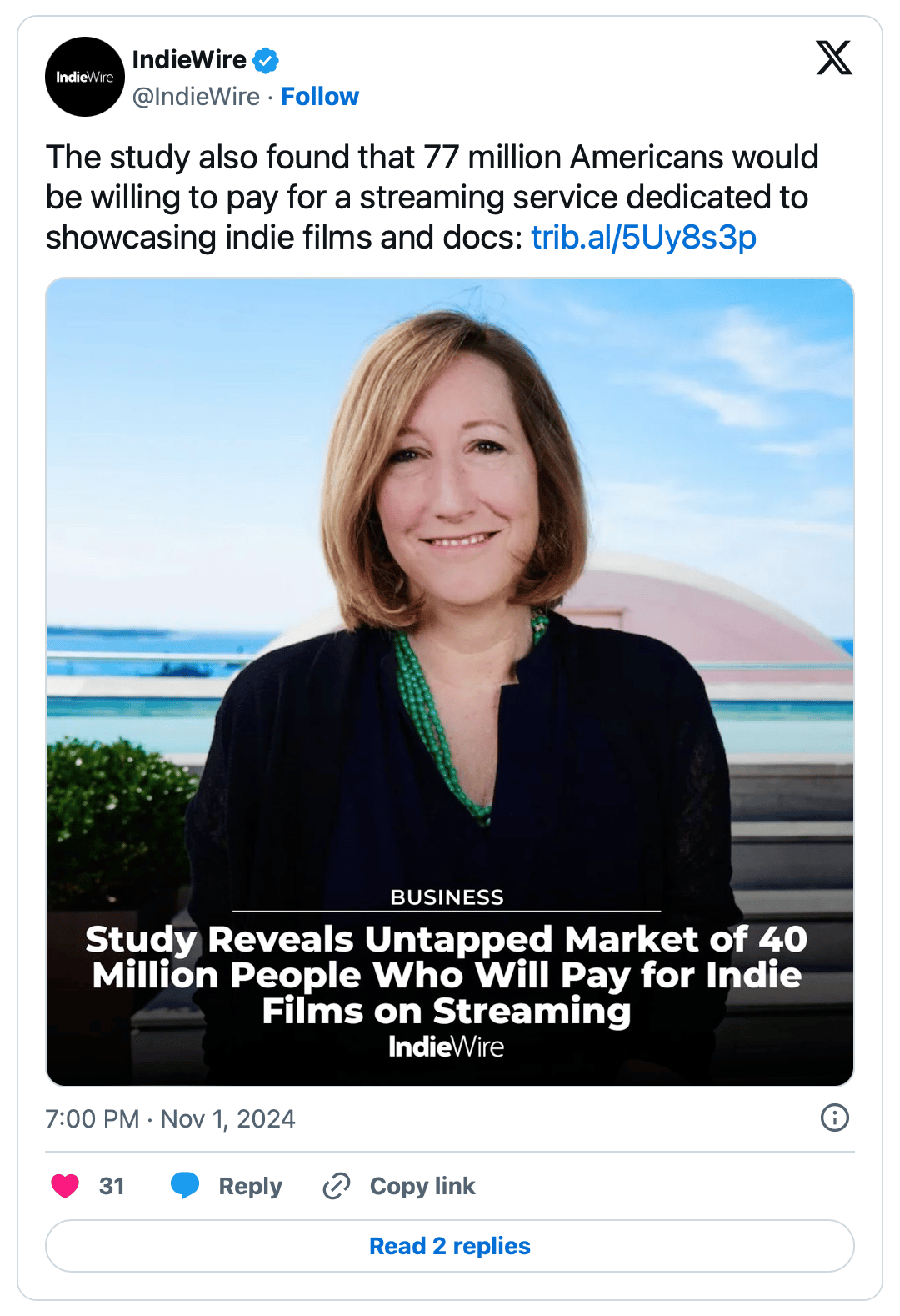 📽️👀 Indie films are leaving a whopping 40M viewers on the table. A mind-blowing study from former Sundance CEO Keri Putnam shows that while just 36.7M Americans currently watch indie films, the potential audience is nearly double that—77M people would actually pay for a dedicated indie streaming service. The 118-page Harvard Kennedy School deep dive, backed by Nielsen and Parrot Analytics, shows how badly streaming platforms are failing indie content: viewership has plummeted from 30M in 2020 to 18M in 2022, mainly because major platforms' algorithms bury indies under mainstream hits and there's no centralized way to discover these films. Coupled with a severe lack of viewership data that makes it impossible to track performance, the indie market is operating blind—yet could potentially double with the right distribution strategy. Putnam's pushing to combine platforms like Criterion and MUBI into one mega indie streaming service, plus creating a trade organization where platforms could safely share anonymous viewing stats. The findings offer a potential lifeline for indie films, which have struggled since theatrical releases peaked in 2017.