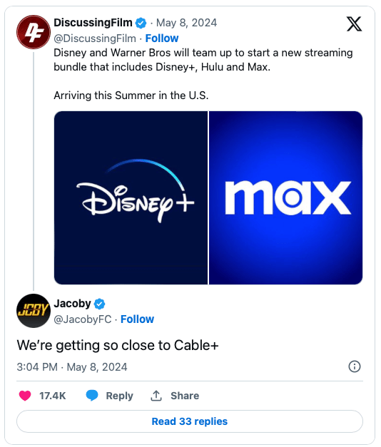 📺💥 WBD's Strategic Bundle: Warner Bros. Discovery (WBD) has announced a powerhouse bundle with Disney and Hulu, set to debut this summer. Whereas the streaming industry in the 2010’s saw companies trying to create all types of content for every consumer, WBD execs say this bundle allows each company to stick to their “lanes”: Disney will focus on kids and family content, and WBD on premium drama, scripted drama, comedy, and nonfiction. WBD CEO David Zaslav is channeling his inner Nostradamus, predicting that this bundling strategy will be as game-changing as the cable revolution of the 2000s. He's betting that not only will this move shake up the streaming world, but it'll also put the heat on independent services to step up their game.
