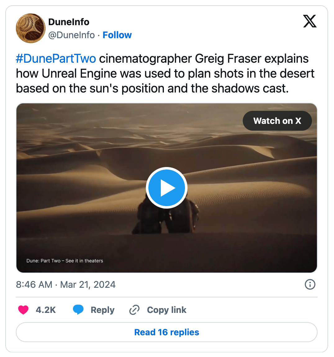 ‘Dune: Part Two’ (2024): Denis Villeneuve's sci-fi epic used UE5 for pre-production planning. The team created virtual environments of the desert planet Arrakis, allowing them to pre-visualize complex shots and optimize their time in the actual desert.