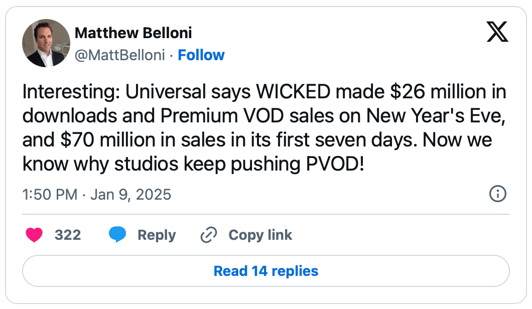 🎬💰 'Wicked' is challenging old Hollywood wisdom about theatrical vs. PVOD revenue streams. Universal reports the musical adaptation is crushing it in digital, raking in $70M in its first week of digital release—their biggest PVOD debut ever—after already conjuring up $682M at theaters. This success flips the script on traditional thinking: rather than hurting ticket sales, releasing films to digital just weeks after their theatrical debut might actually work in studios' favor. Universal's been testing these waters since COVID, moving away from the old three-month theater exclusive window to getting movies on digital platforms faster. While some fans grumble about paying premium prices for early home viewing, 'Wicked's' performance suggests the strategy works—at least for blockbusters. With studios keeping a bigger cut of digital sales (80%) compared to theater tickets (50-65%), and Universal's total PVOD revenue surpassing $1.5B since launching their shortened-window strategy, the industry might need to rethink its release playbook.