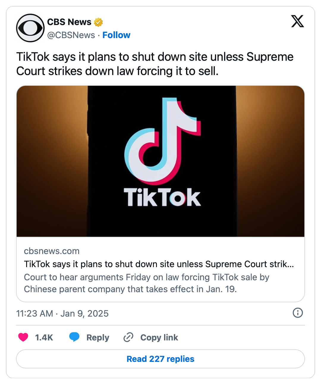 📱⚖️ TikTok's fate hangs in the Supreme Court balance today. The social media powerhouse is fighting to avoid a Jan. 19 shutdown that could cut off its 170M U.S. users. The stakes are particularly high for entertainment marketers, who've made TikTok a cornerstone of film and TV promotion—the platform's algorithm has proven uniquely powerful at driving youth audiences to theaters and streaming platforms. The drama has a political twist: President-elect Trump, now a TikTok super-user with 14.7M followers, is pushing for time to broker a deal after dining with CEO Shou Zi Chew at Mar-a-Lago. Meanwhile, content creators who've turned TikTok into a booming short-form entertainment ecosystem are anxiously eyeing backup platforms. The platform's potential shutdown threatens to disrupt both traditional studios' marketing playbooks and an emerging generation of digital storytellers who've found success with TikTok's vertical video format. With the company claiming it could lose a third of daily users from just a month-long shutdown, the court's decision could reshape not just social media, but much of Hollywood's digital strategy.