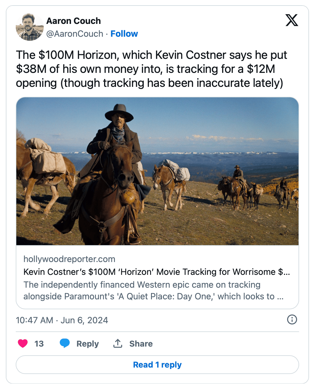 🎬🌄 Kevin Costner's $100M Western epic, ‘Horizon: An American Saga — Chapter One,’ is facing a tough road ahead. Early tracking is suggesting a lackluster $12M domestic opening, which might be more of a “yee-naw” than a “yee-haw.” Despite Warner Bros.' efforts to rally Costner's ‘Yellowstone’ fanbase, the film faces stiff competition from Paramount's ‘A Quiet Place: Day One,’ which is projected to open with a whopping $40M on the same weekend. Despite the gloomy outlook, Costner's keeping his spurs on and his head held high, banking on his middle-America followers to prove the doubters wrong. The next few weeks will be critical as these two films go head-to-head at the box office, with Costner's Western grit on the line.